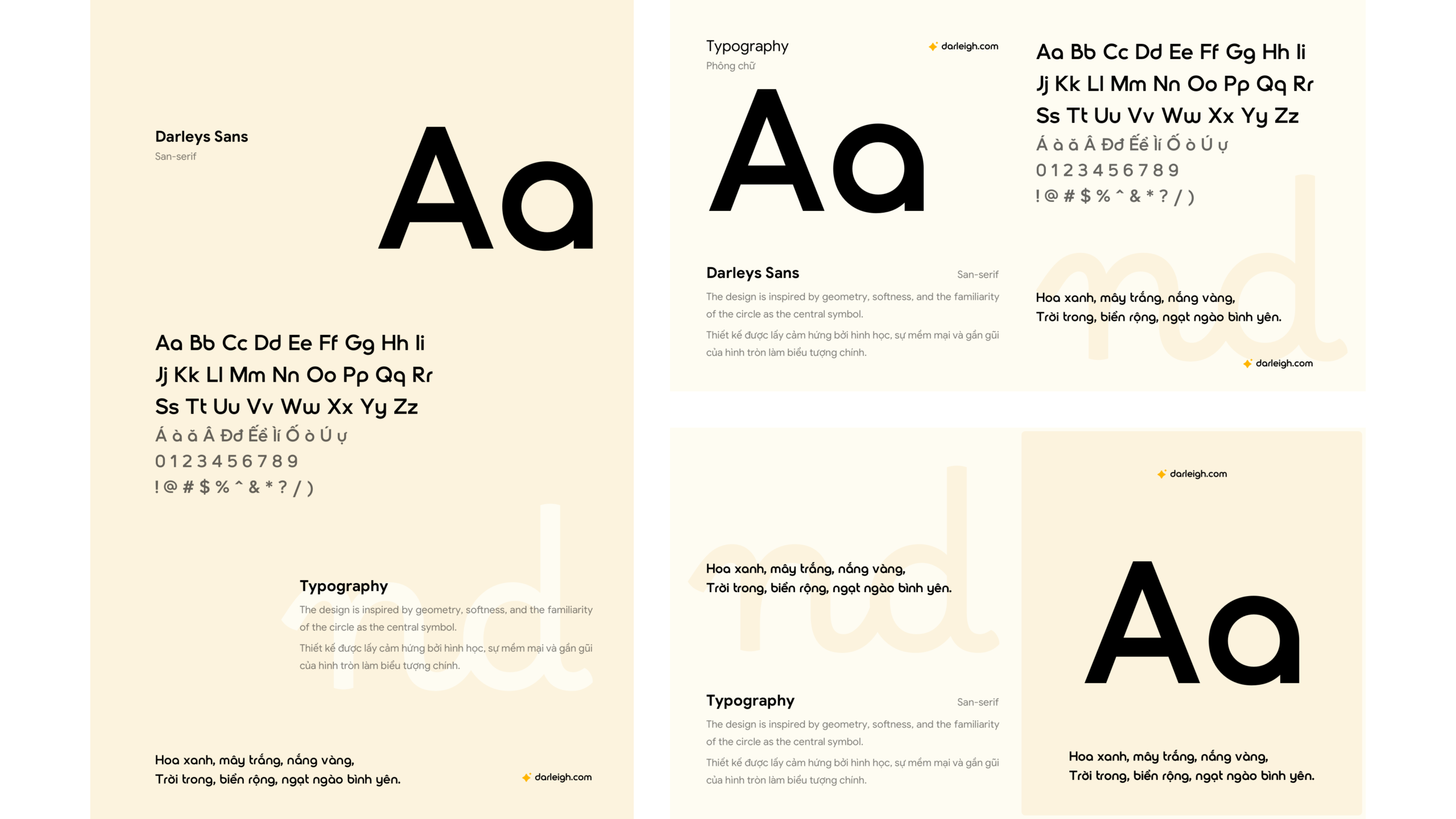 Darleys Sans là một kiểu chữ không chân mang phong cách hiện đại, được thiết kế với cảm hứng từ các yếu tố hình học. Tinh thần chủ đạo của phông chữ là sự mềm mại và gần gũi, được thể hiện thông qua các đường nét bo tròn – lấy hình tròn làm biểu tượng thiết kế trung tâm.